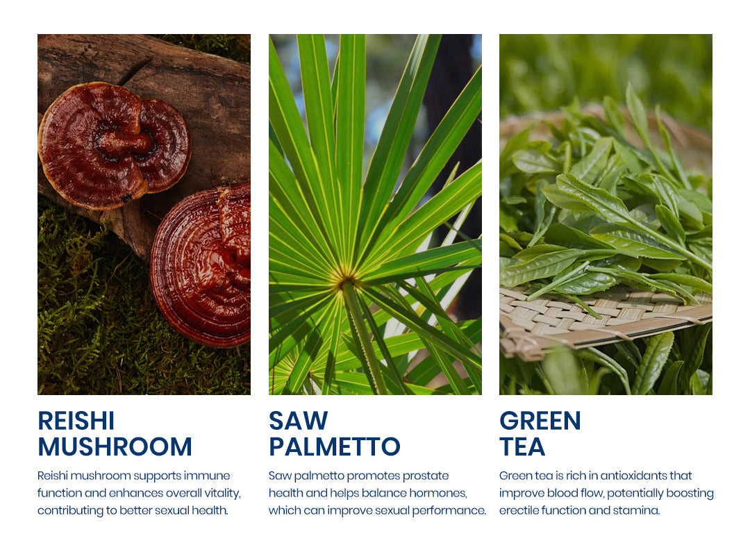 The key ingredients include Reishi Mushroom, Saw Palmetto, and Green Tea Extract, which work together to improve prostate and urinary health.